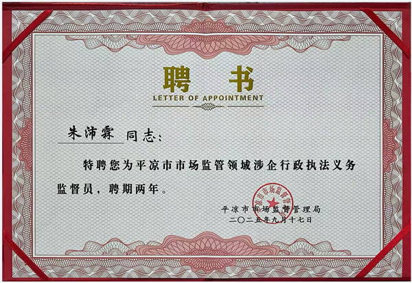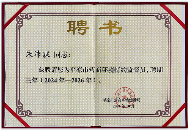 2024年10月被平?jīng)鍪袪I(yíng)商環(huán)境建設(shè)局聘請(qǐng)為“平?jīng)鍪袪I(yíng)商環(huán)境特邀監(jiān)督員”。
